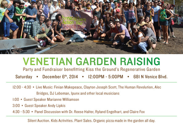 Kiss the Ground Festival Anonymous December 6, 2014 Loading Map.... Beyond Baroque Lawn681 Venice Blvd. - VeniceEvents 33.991344 -118.458862 Date/Time Date(s) - 12/06/201412:00 pm - 5:30 pm Location Beyond Baroque Lawn Categories Annual Events Arts and culture Featured Event Food and drink Kids' events Live Music We’re having a party – join us at the Venice Arts Plaza – Kiss the Ground Garden. We’re listening to music, eating pizza out of the earthen oven, listening to speakers, and raising funds through a silent auction. Saturday’s Garden Party Lineup: 12 Matthew August Leddy and Erica Barnes 12:20 Matt Dixson 12:40 Alec Bridges 1:00 Speaker: Marianne Williamson 1:25 The Human Revolution 2:00 Clayton Joseph Scott 2:30 Malte Hagemeister 2:55 Speaker: Gunnar Lovelace– Thrive Market 3:00 Speaker: Andy Lipkis – TreePeople 3:25 Finian Makepeace 3:45 Aiden Makepeace 4:05 Eduardo Manilla Loboman_DJ 4:30 Panel Discussion inside Beyond Baroque: “Urban Food and Community Participation” Ryland Engelhart of Cafe Gratitude Venice, Claire Fox of Los Angeles Food Policy Council, Rishi Kumar of The Growing Home and Reese Halter Conservation Biologist and Author Donations accepted all day – proceeds benefit Kiss the Ground and the Venice Arts Plaza Garden Funds raised are for the community stage, greenhouse, and rainwater tank for the garden. Activities include: Pizza – made in the garden from the earthen cob pizza oven. Plant Sales Information about Kiss The Ground Kids Activities For more info: https://www.facebook.com/events/400281720134843/