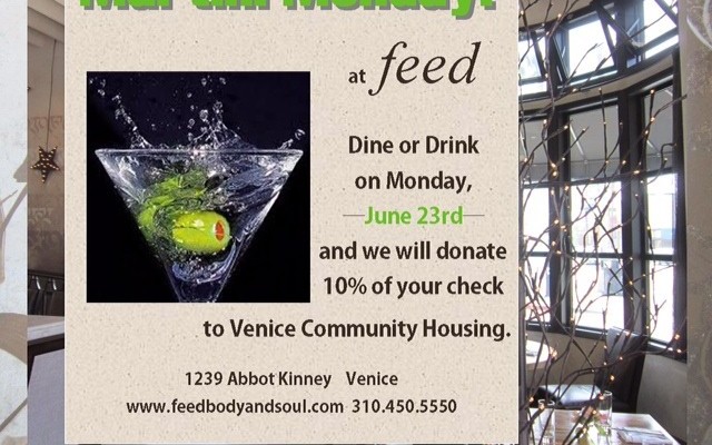 Martini Monday, June 23 at FEED Anonymous June 23, 2014 Loading Map.... FEED1239 Abbot Kinney Blvd, 90291 - VeniceEvents 33.9913635 -118.46837399999998 Date/Time Date(s) - 06/23/201411:00 am - 11:00 pm Location FEED Categories Food and drink Join us to taste Venice chef David Wolfe’s fine fare, try a great martini (or jalopeno gimlet), have some fun, all to benefit Venice Community Housing, a 25 year old Venice non profit creating housing for over 500 people and providing opportunities for education, employment, after school tutoring and other important programs for the areas low income population. www.vchcorp.org. For more information, call Linda Lucks @ 310-399-4100 ext 131. For more info: www.vchcorp.org